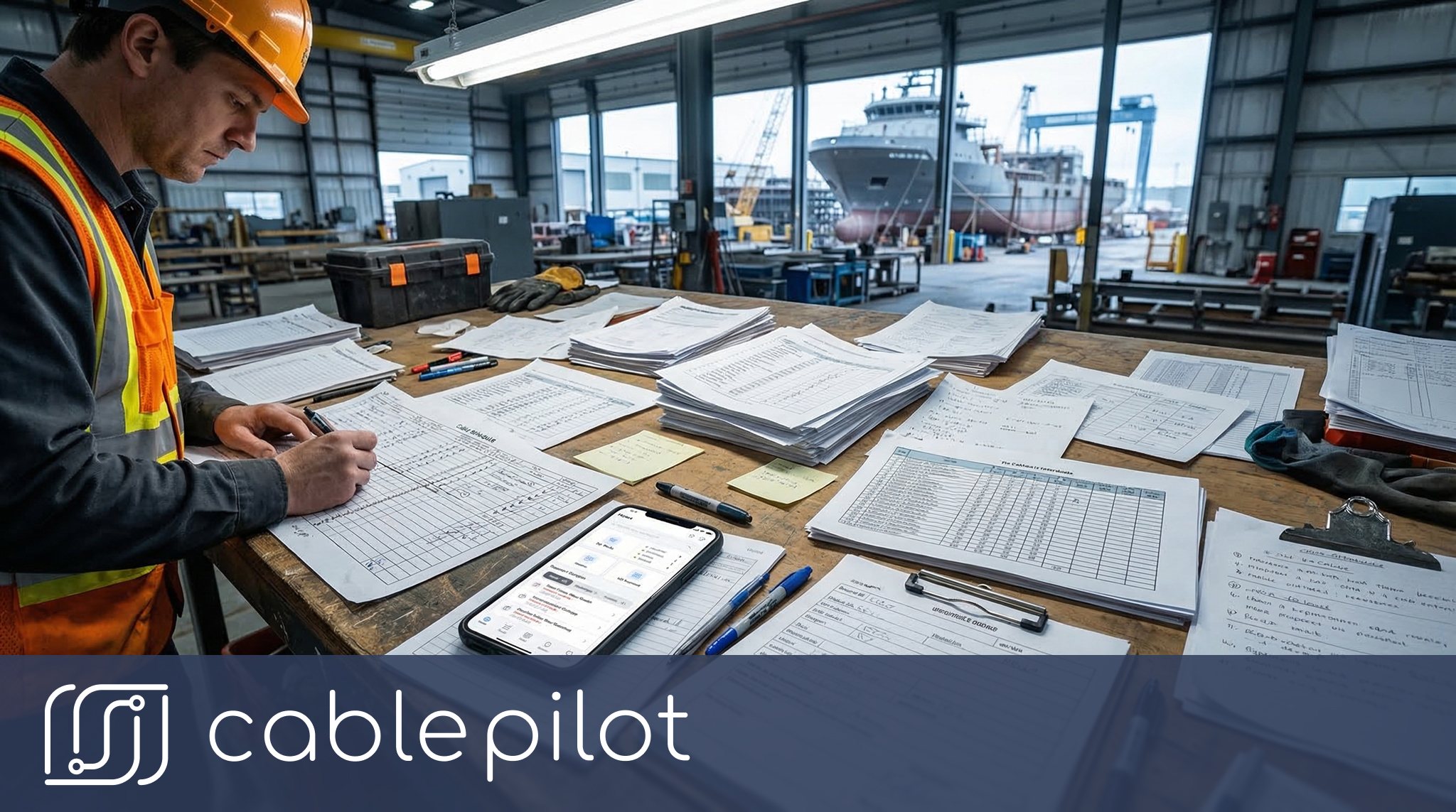 Traditional electrical installation reporting in shipbuilding follows a pattern unchanged for decades. Electricians receive printed cable lists at morning briefings, work through their assignments throughout the shift, and make pencil marks on paper—checkmarks, dates, notes about obstacles encountered. At shift’s end, they transcribe this information onto formal reporting sheets or hand marked-up papers to supervisors.