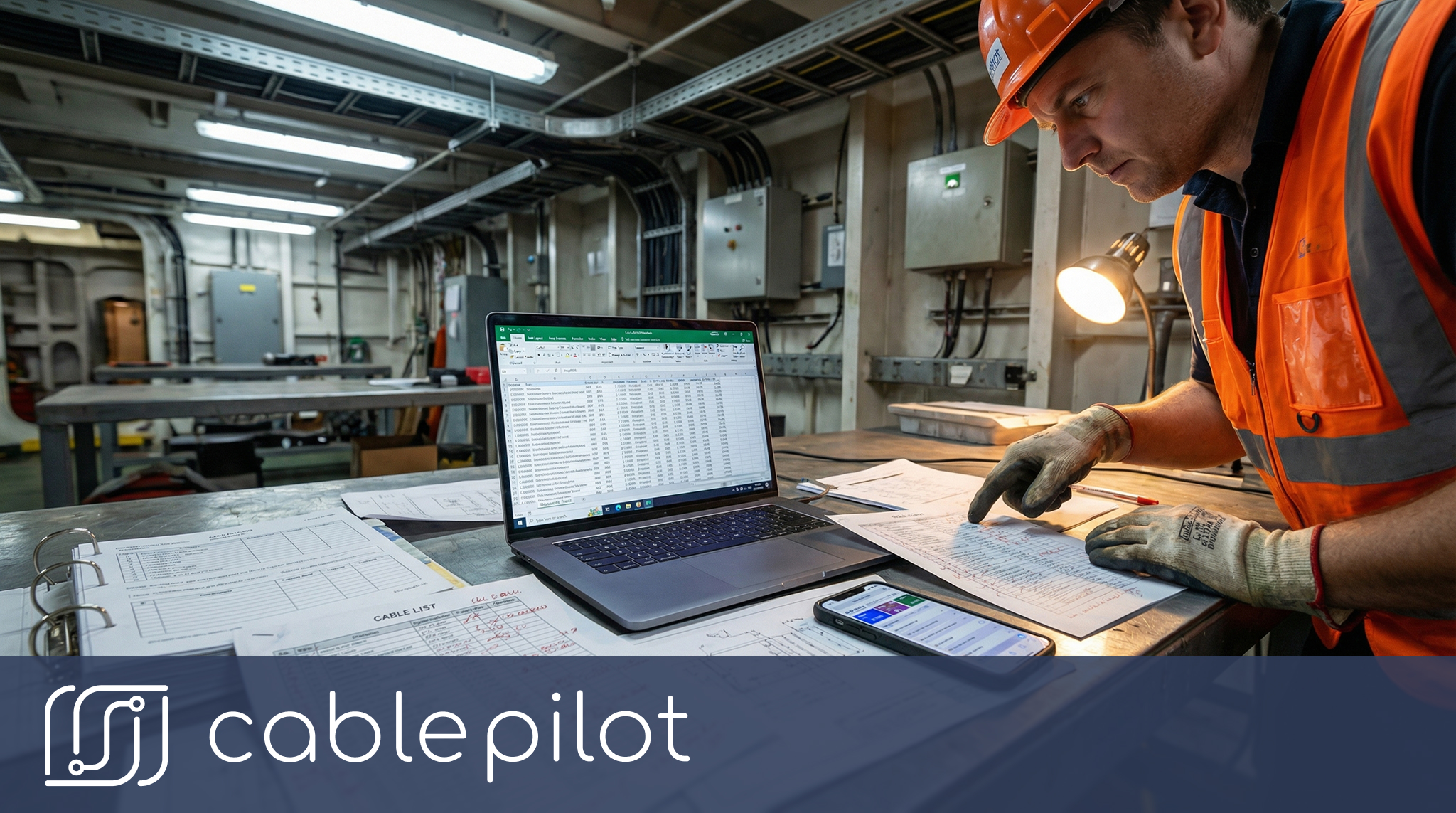 The electrical installation foreman receives an email with a PDF cable list for compartment E-04: 87 cables to install. He prints the list and brings it to the compartment. His team consults a separate PDF drawing showing routing paths, also printed and already marked up from previous work in adjacent compartments—though nobody’s certain if those markups apply here.